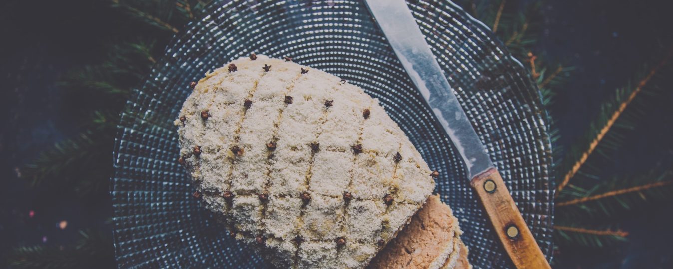 Irrota folio ja voitele kinkun pinta dijon-sinapilla. Ripottele päälle manteli- tai korppujauhoja ja koristele pinta halutessasi veitsellä tehdyllä ristikolla ja neilikoilla.