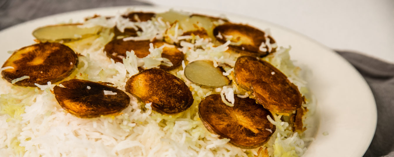 Perunat ruskistuvat kauniisti riisin alla ja ne maistuvat hyviltä. Ne voi tarjoiltaessa asetella riisin päälle persiljan kanssa.